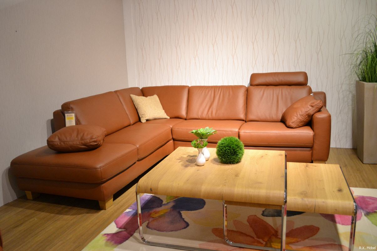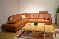 Zeitlose Polstergarnitur in hochwertigem Echtleder Credo cognac. Davorstehend im rechten Sitz ist eine motorische Wall-Free-Funktion verbaut. Diese fährt eine Fußstütze heraus, so dass Sie komfortabel liegen können.