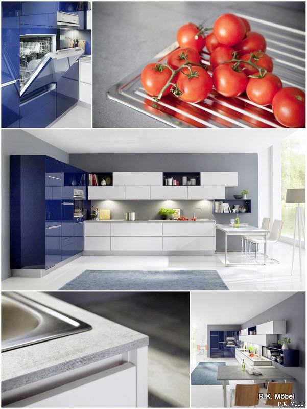 Unsere Einbauküche Flash vereint mehrere Trends. Die Kombination aus blauen und weißen Hochglanzfronten in Kombination mit der grifflosen Ausführung Line-N sorgt für eine moderne Atmosphäre.