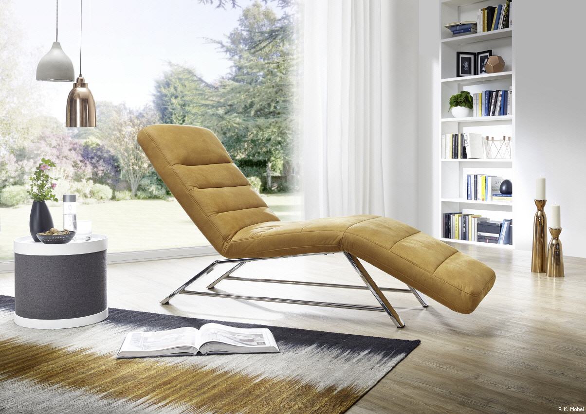 Hier eine weitere Relax-Liege aus unserem Liegensystem TL 1667. Diese Zusammenstellung zeigt eine 65 cm breite Liege in Stoff S kurkuma mit Metallkufe als Untergestell.