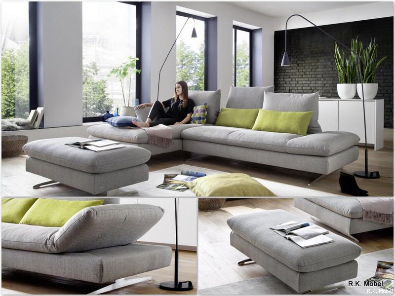 Die farbigen Nierenkissen schaffen einen tollen Kontrast zu dem edlen Grauton Oasis 21. Die Metallkufe unterstreicht die moderne Linie dieses Traumsofas. Stellmaß ca. 172 x 317 cm, Hockerbank ca. 120 x 60 cm